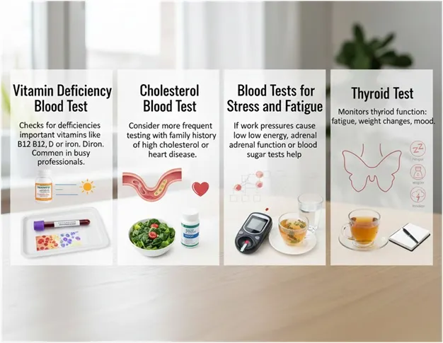 • Vitamin Deficiency Blood Test: To check for deficiencies in important vitamins like B12, D, or iron, which are common in busy professionals who don’t get enough sunlight or eat balanced meals.